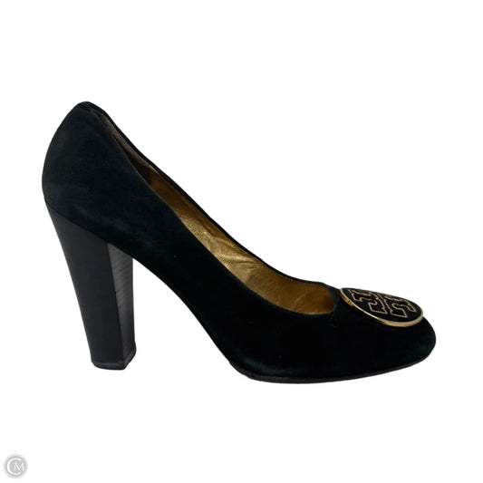 AS IS Velvet Logo Heel Shoes Designer By Tory Burch In Black & Gold, Size: 8