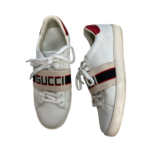 Shoes Luxury Designer By Gucci In Cream & Red, Size: 7.5