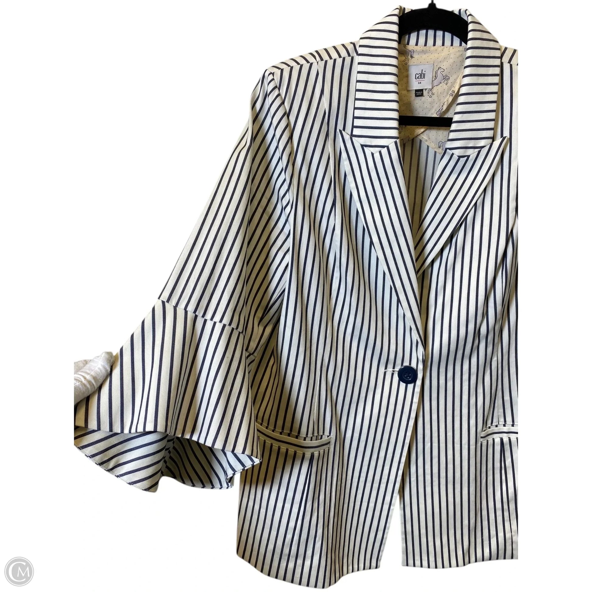 Step out in style with this chic striped blazer from Cabi in size 14. Crafted with impeccable quality, this blazer exudes sophistication and elegance effortlessly. A must-have for your wardrobe.