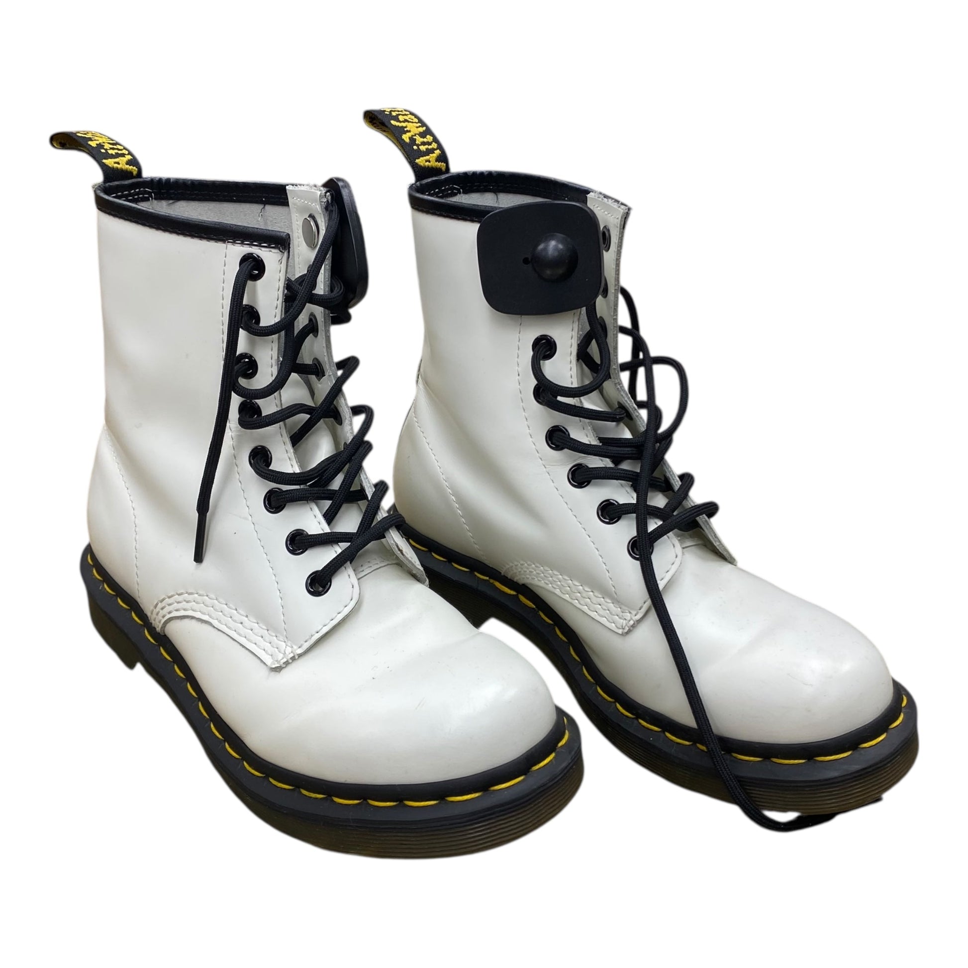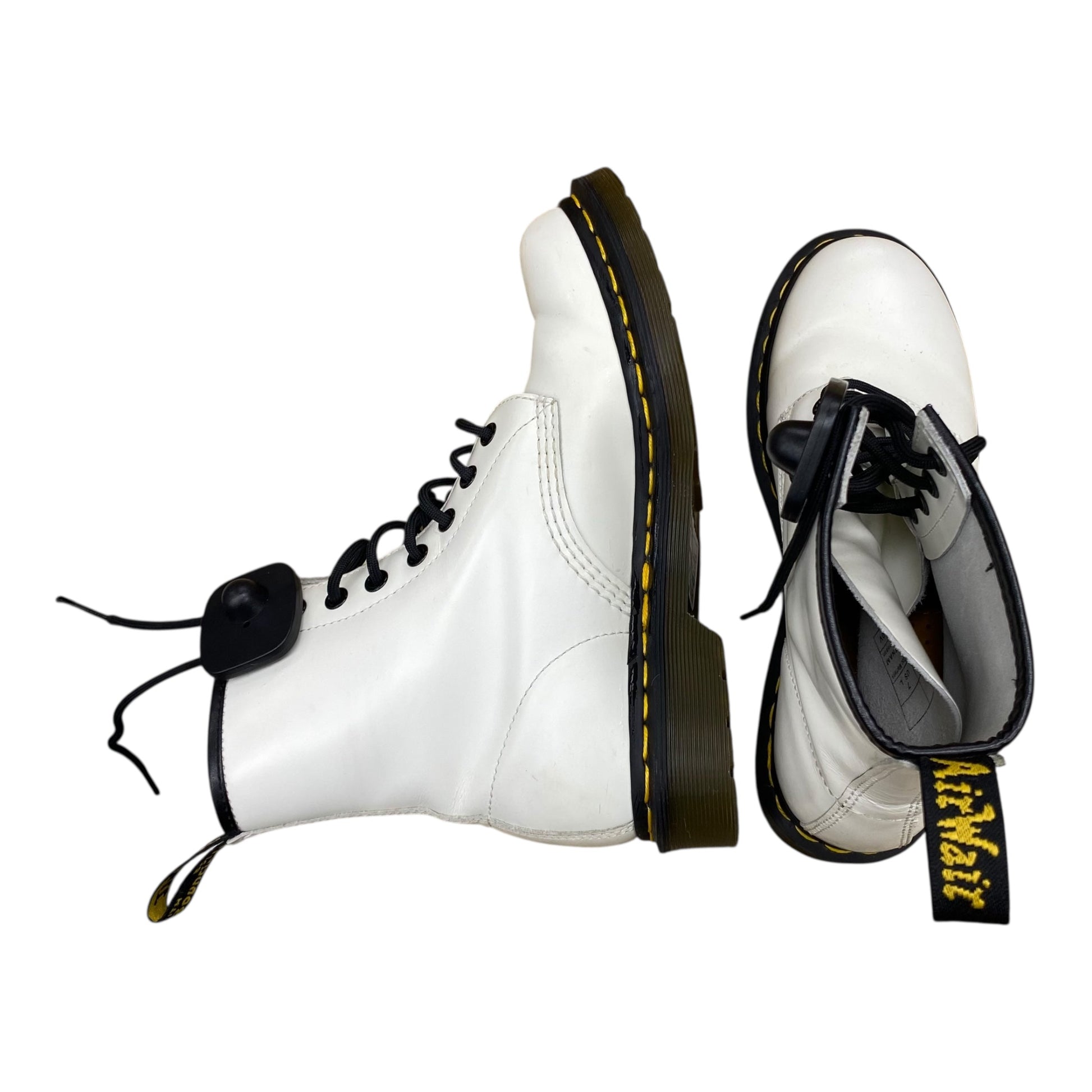 Step into the future of fashion with these sleek white designer boots by Dr. Martens. Size 7. Crafted for the modern trendsetter, these boots boast premium quality, undeniable style, and a confidence-boosting fit. Dominate the streets in style.