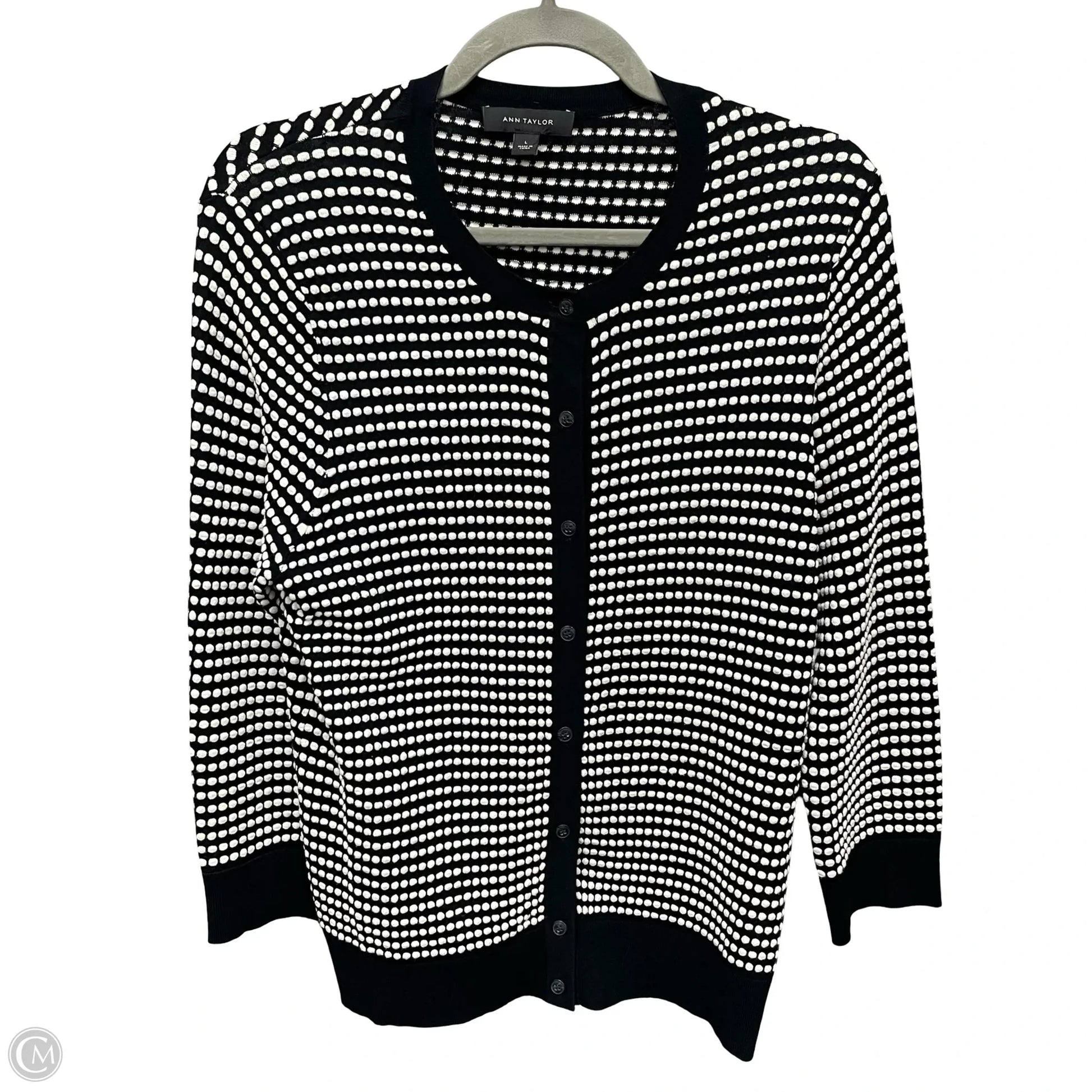 Wrap yourself in timeless elegance with this Ann Taylor Cardigan in Black & White, Size L. Luxuriously soft fabric, classic color combo, and versatile style for everyday chic comfort.