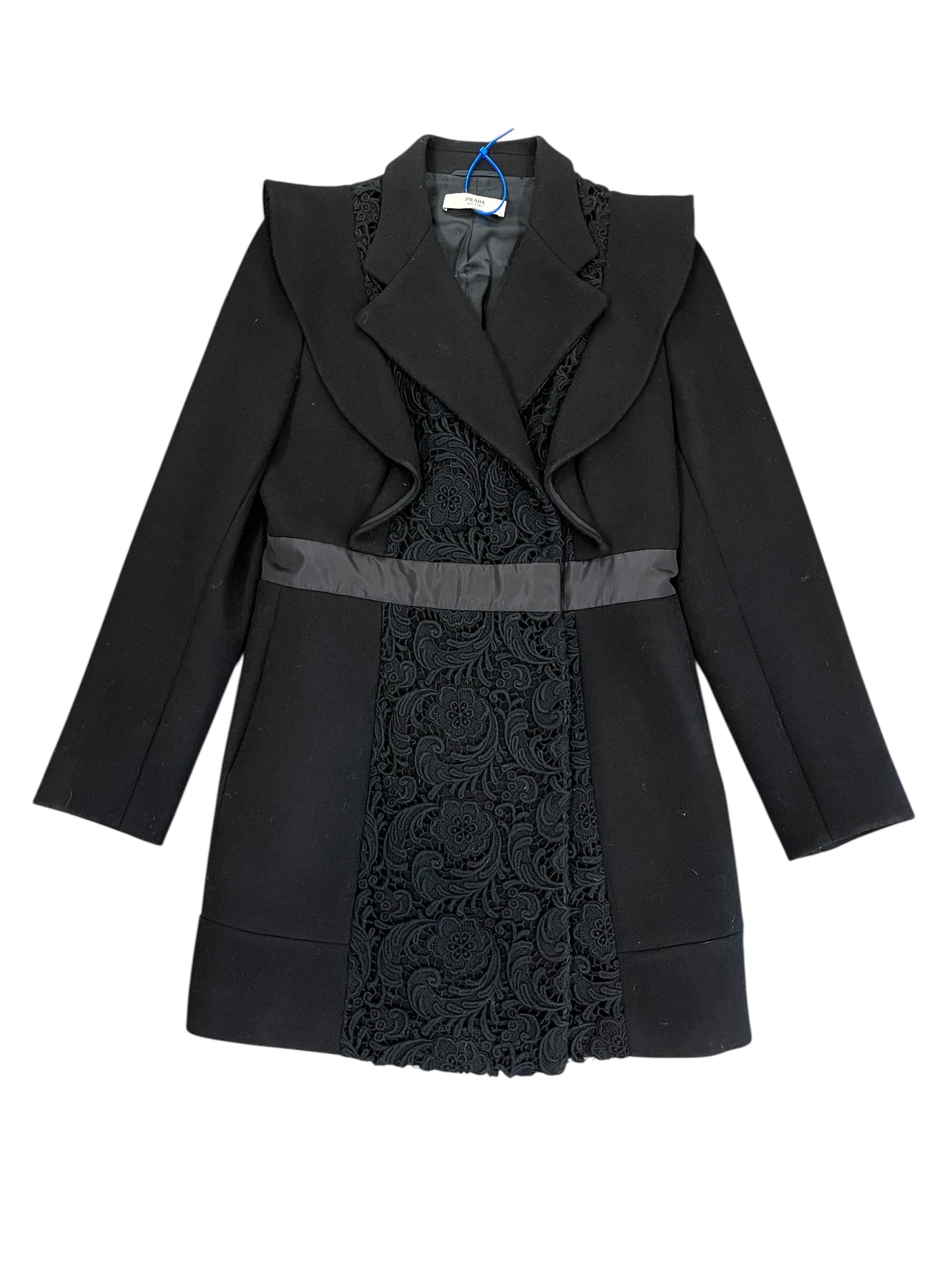 Indulge in the opulence of a Prada designer coat in sleek black, size S. Impeccable craftsmanship meets unparalleled style for a wardrobe essential that exudes confidence and sophistication. Own your look.