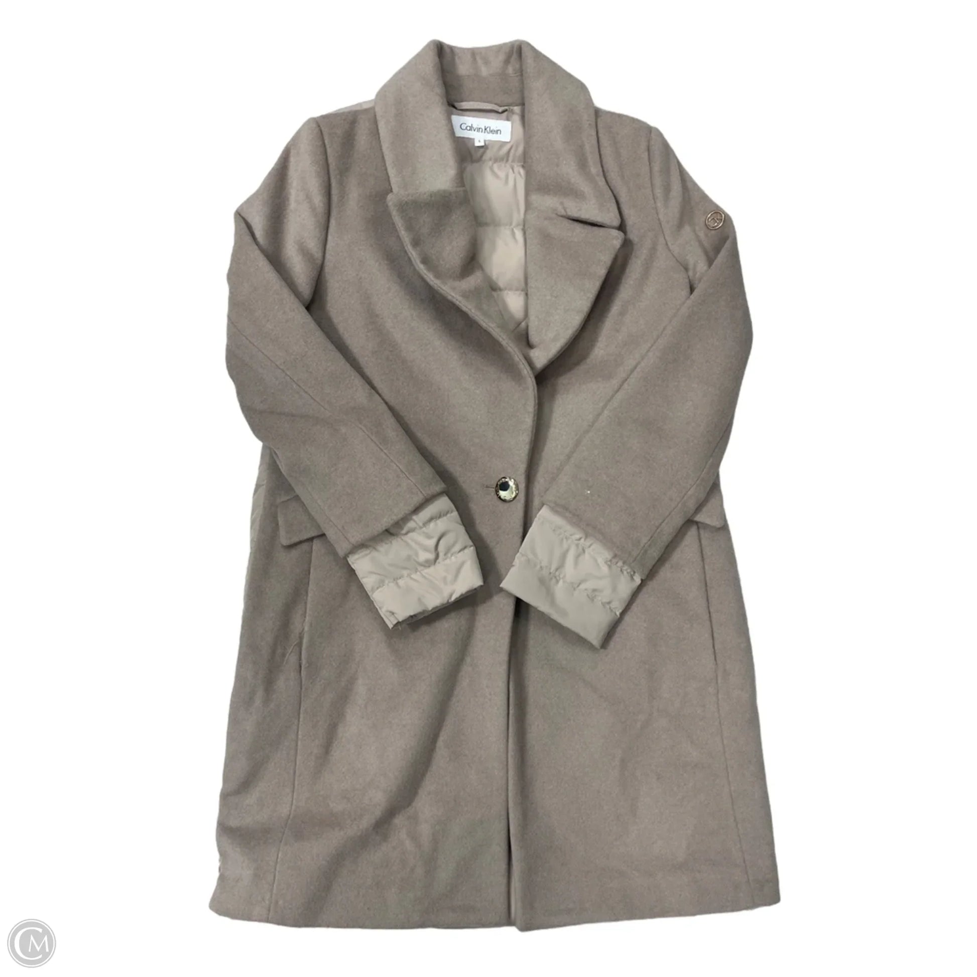 Minimalist sophistication in Calvin Klein's taupe peacoat, size S. Elevate your winter wardrobe effortlessly with timeless style.