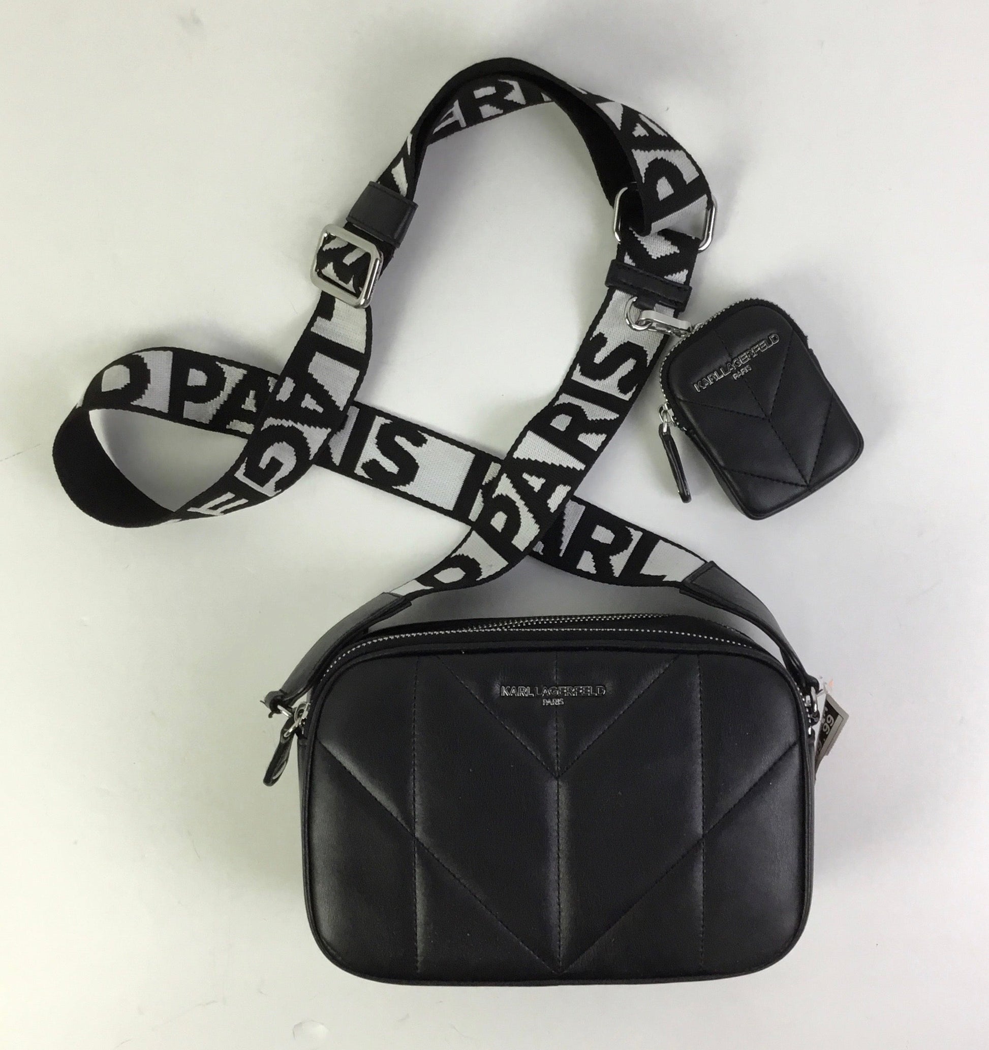 Indulge in the sophistication of Karl Lagerfeld's black designer crossbody bag. Compact size, iconic style, and timeless elegance.
