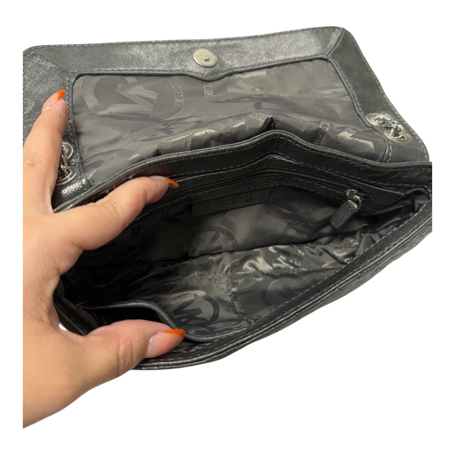 Crossbody Designer By Michael Kors In Silver, Size:Medium