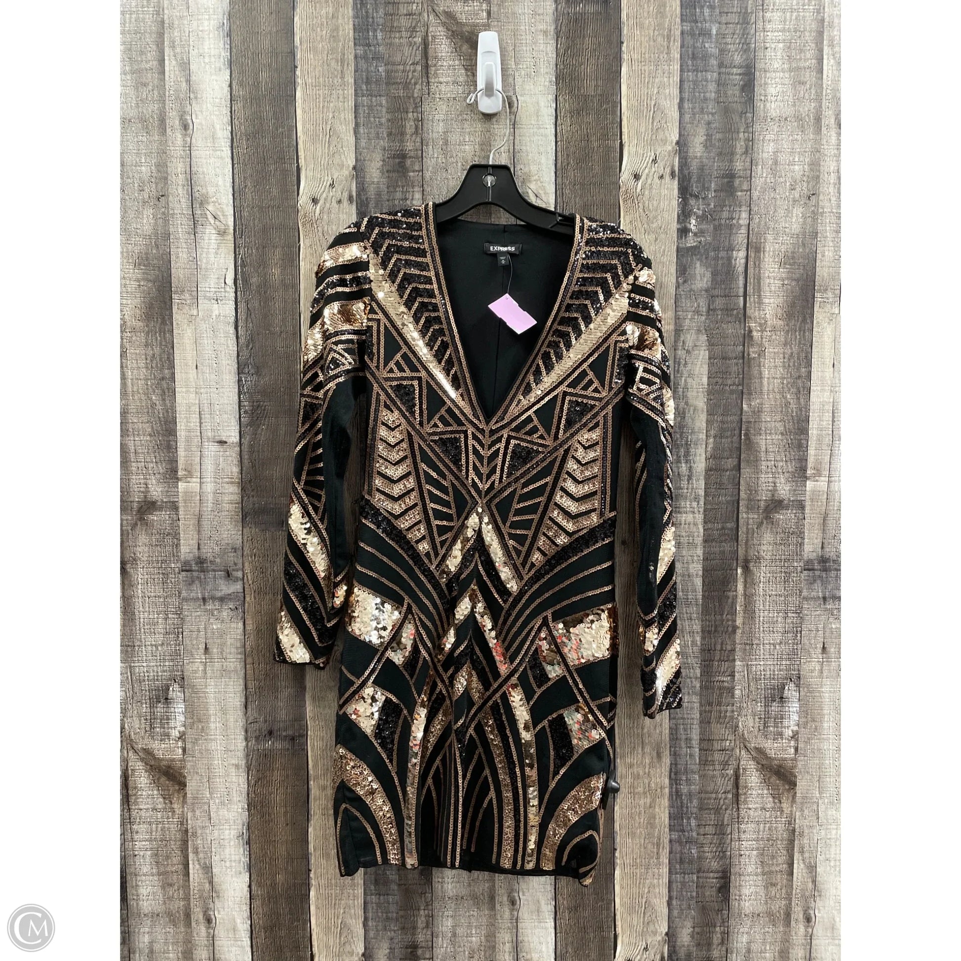 Command attention at any party with this stunning black and gold dress from Express. Size M, exuding elegance and confidence effortlessly. Stand out.
