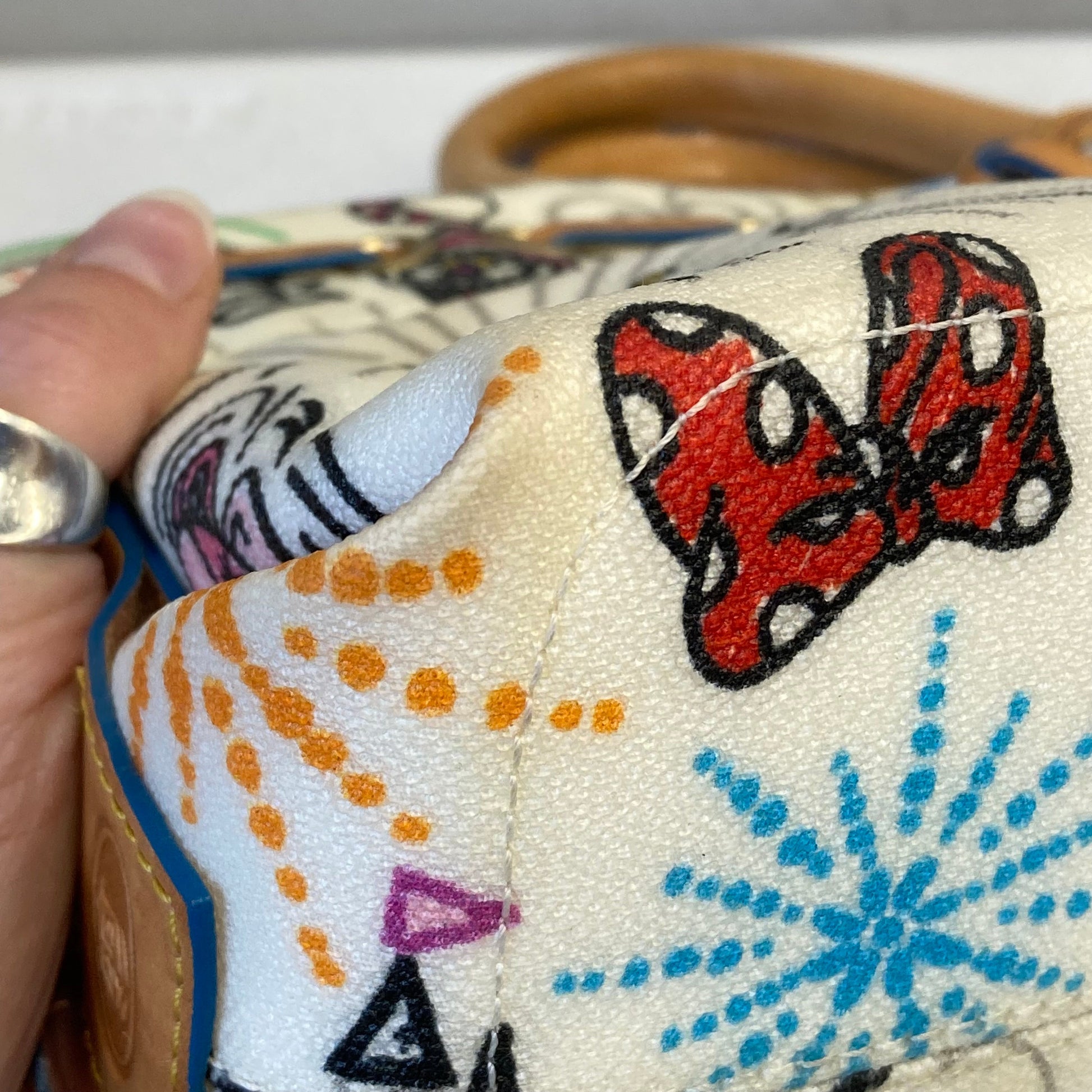 Chic Dooney & Bourke handbag in playful multi hues, medium size.