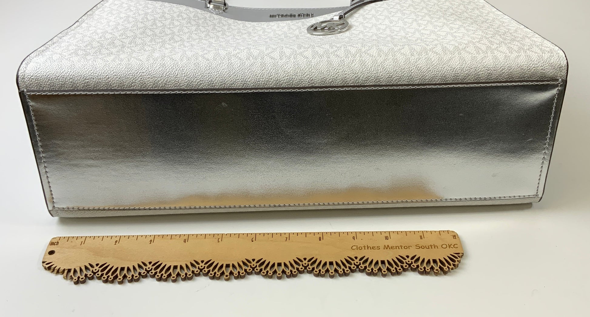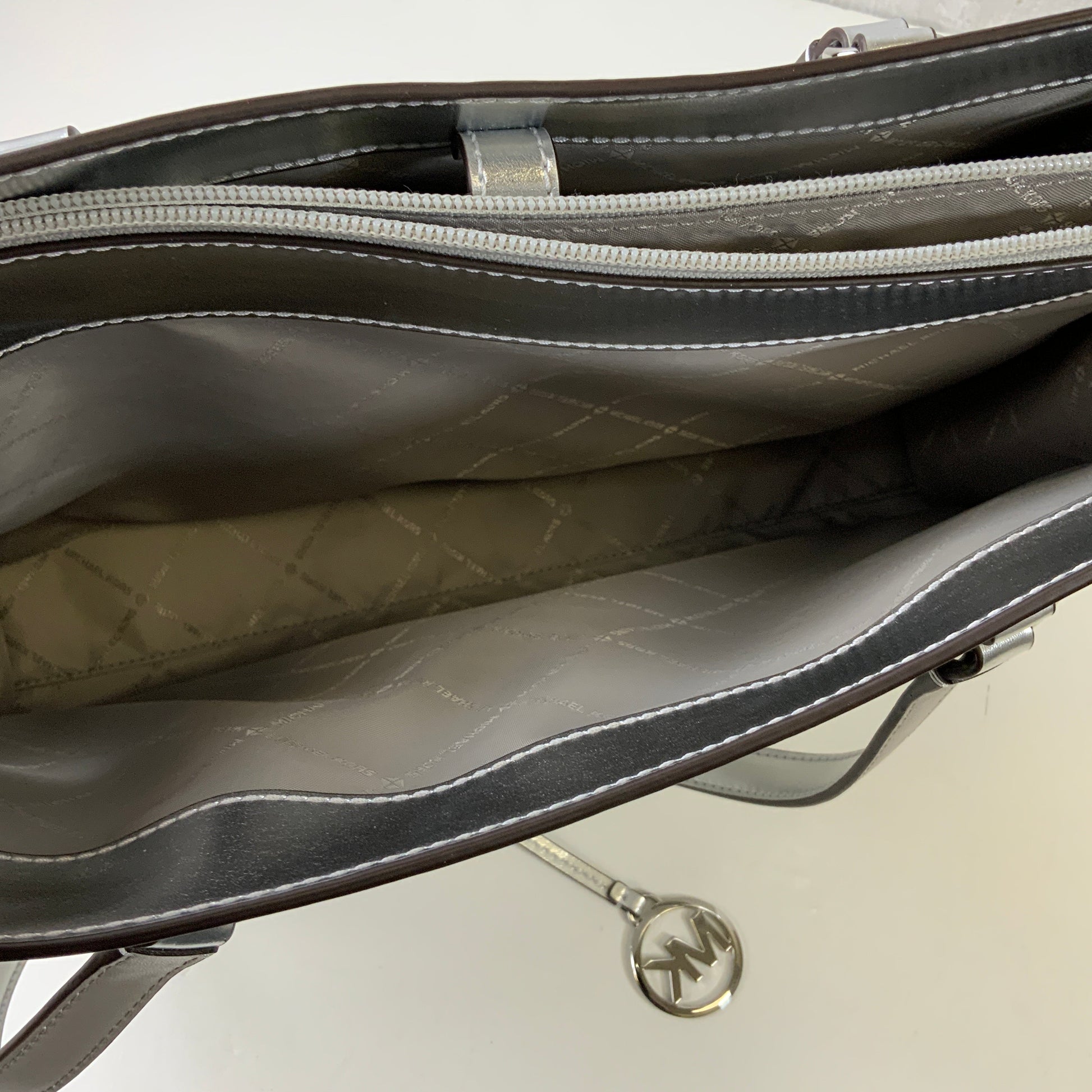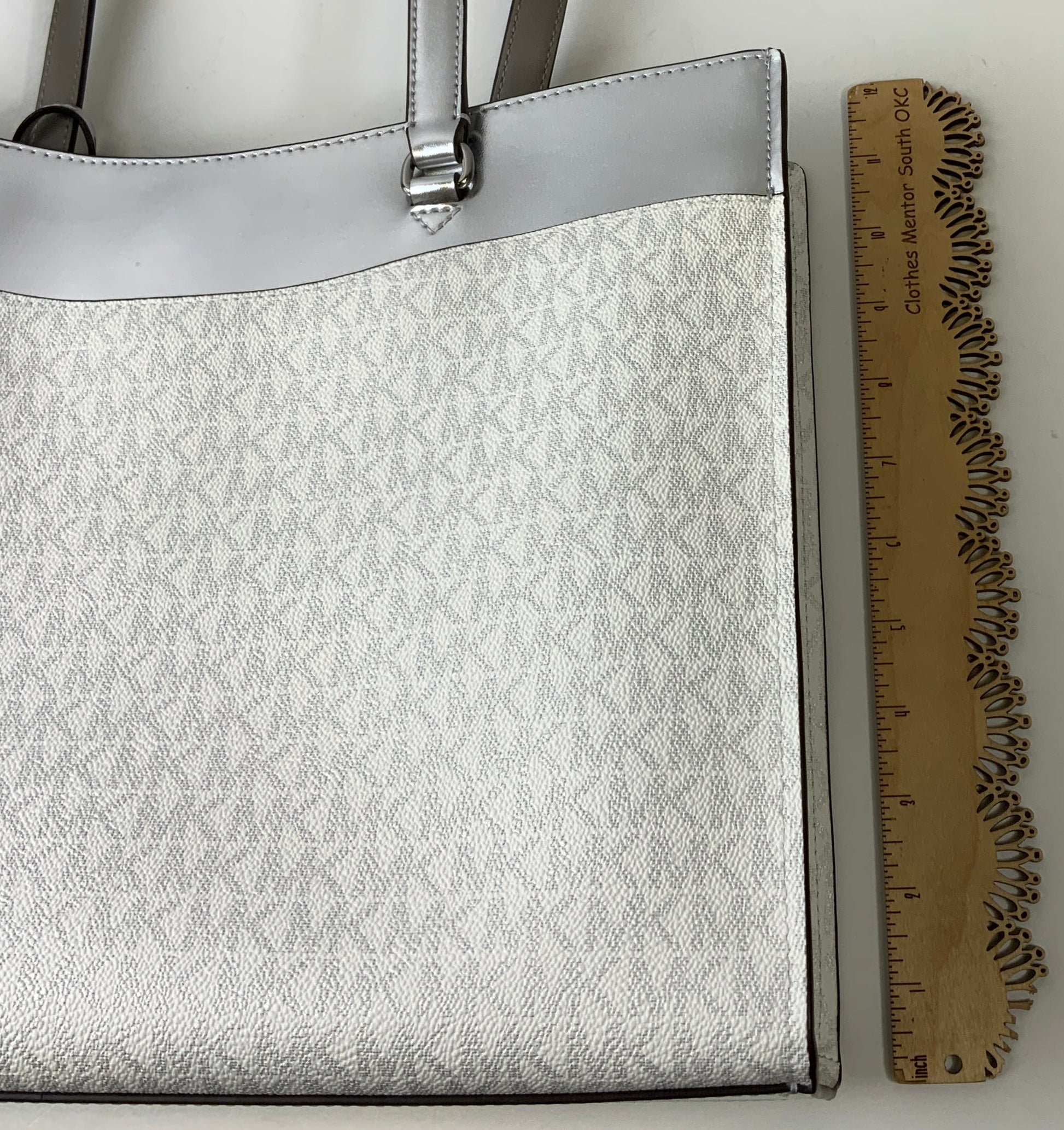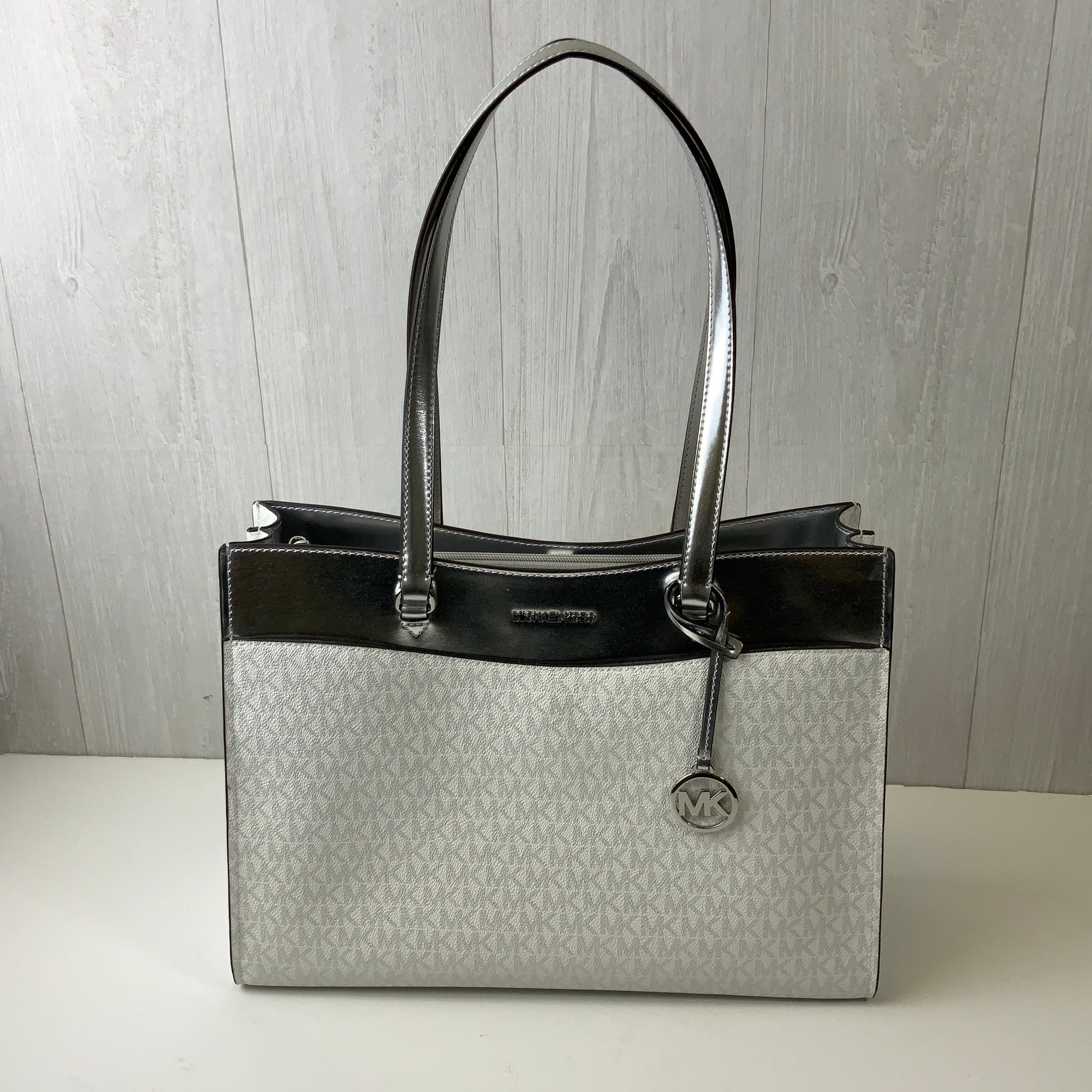 Indulge in the chic sophistication of this Michael Kors designer handbag in silver and white. Large size offers ample space for essentials with elegant style.