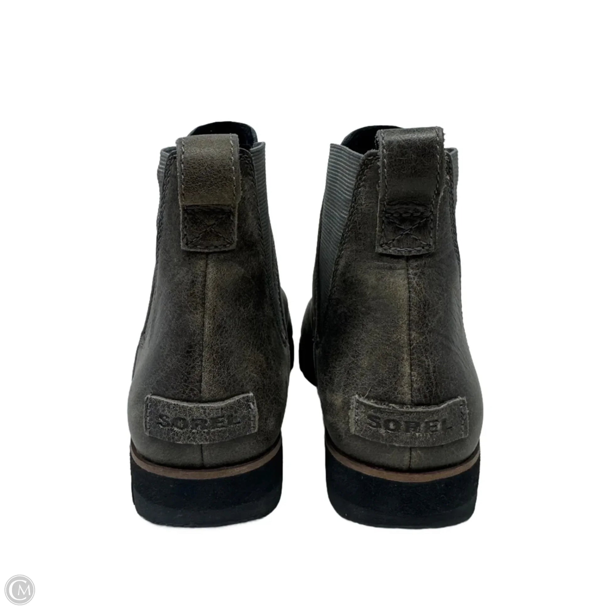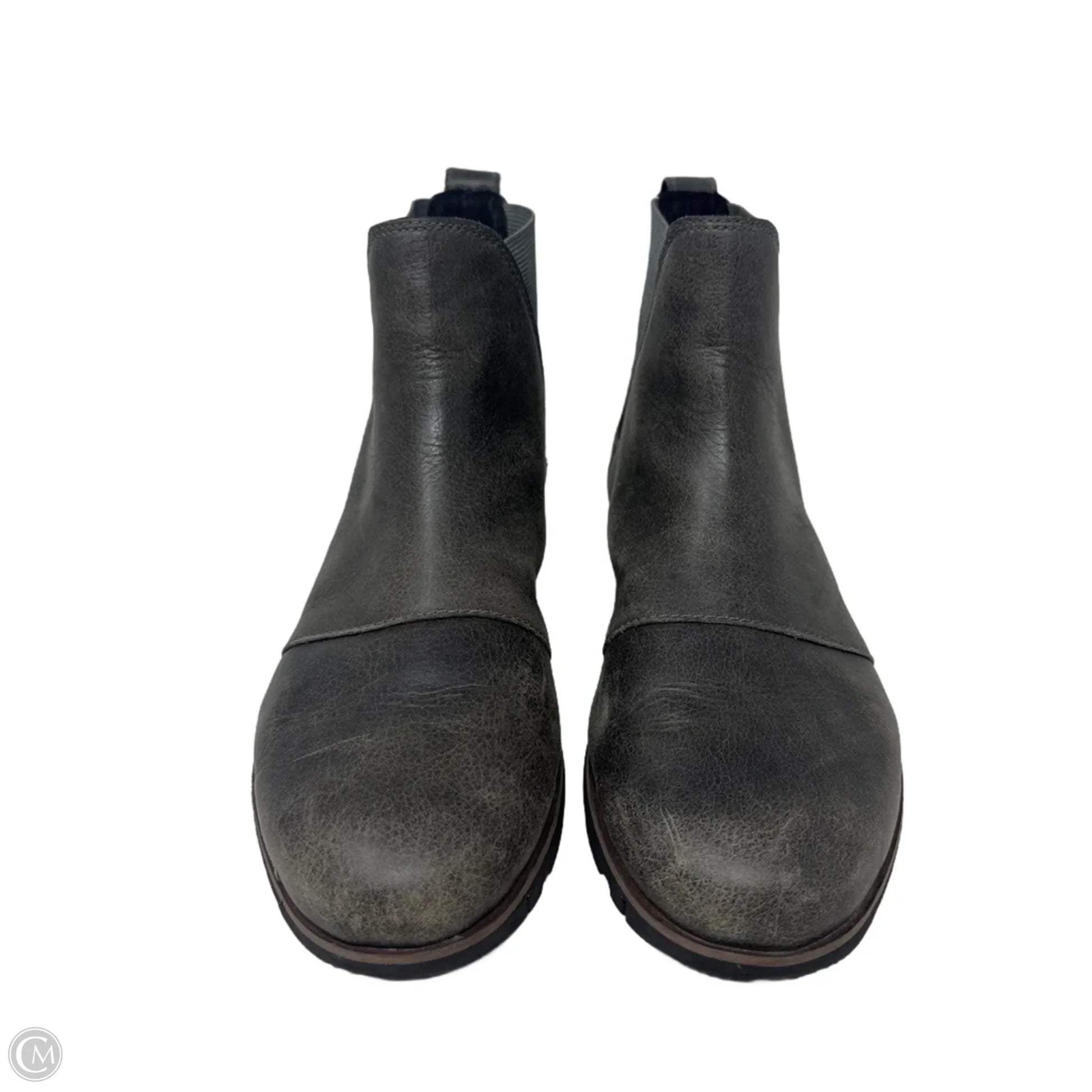 Sorel's Harlow ankle boots in grey, size 9, offer comfort and style effortlessly.