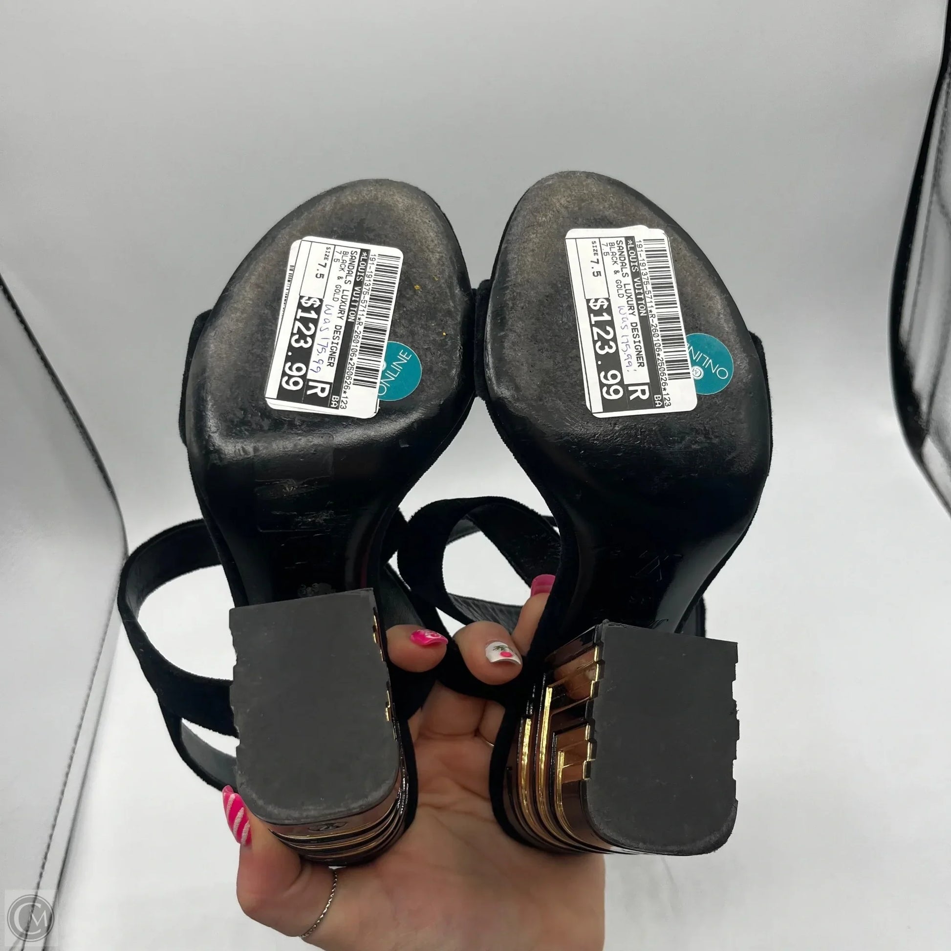Indulge in sophistication with these exquisite Louis Vuitton sandals in black and gold, size 7.5. Crafted with meticulous detail, they exude luxury and timeless elegance. Elevate your look effortlessly. Buy now.
