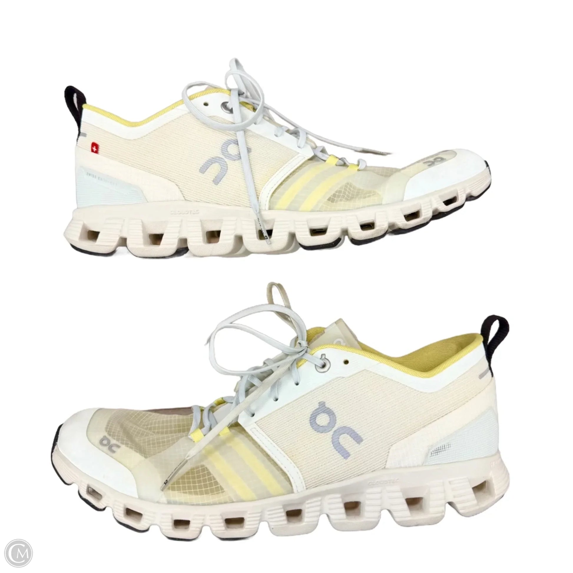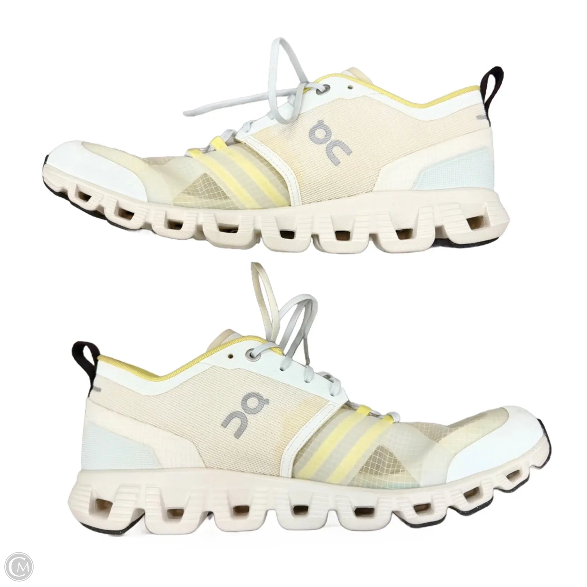 Stride confidently in On Cloud's White & Yellow Athletic Shoes, size 10. Lightweight with responsive cushioning, these shoes offer a unique blend of style, comfort, and performance.