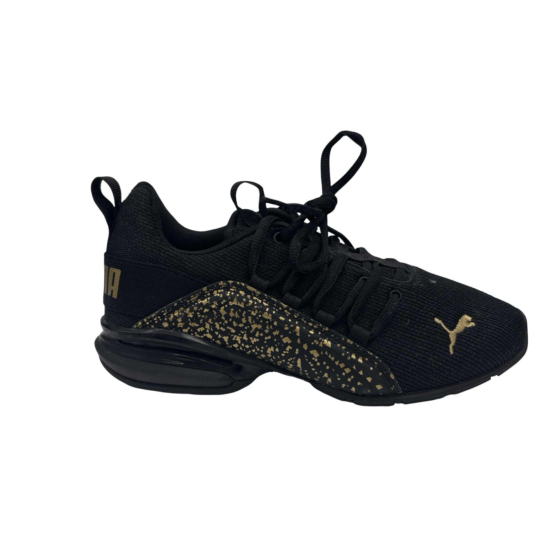 Stride in style with Puma's black and gold athletic shoes in size 6.5. Experience comfort, performance, and flair with every step taken. Feel the power of Puma.