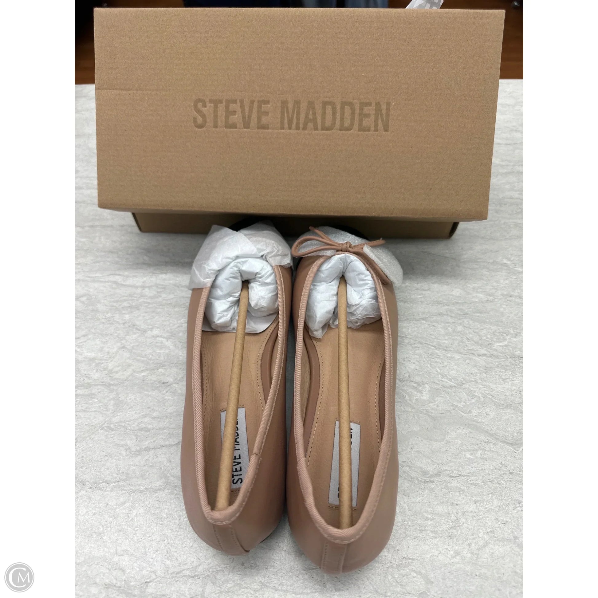 Step into sophistication with Steve Madden's black and tan flats in size 10. Classic elegance awaits.