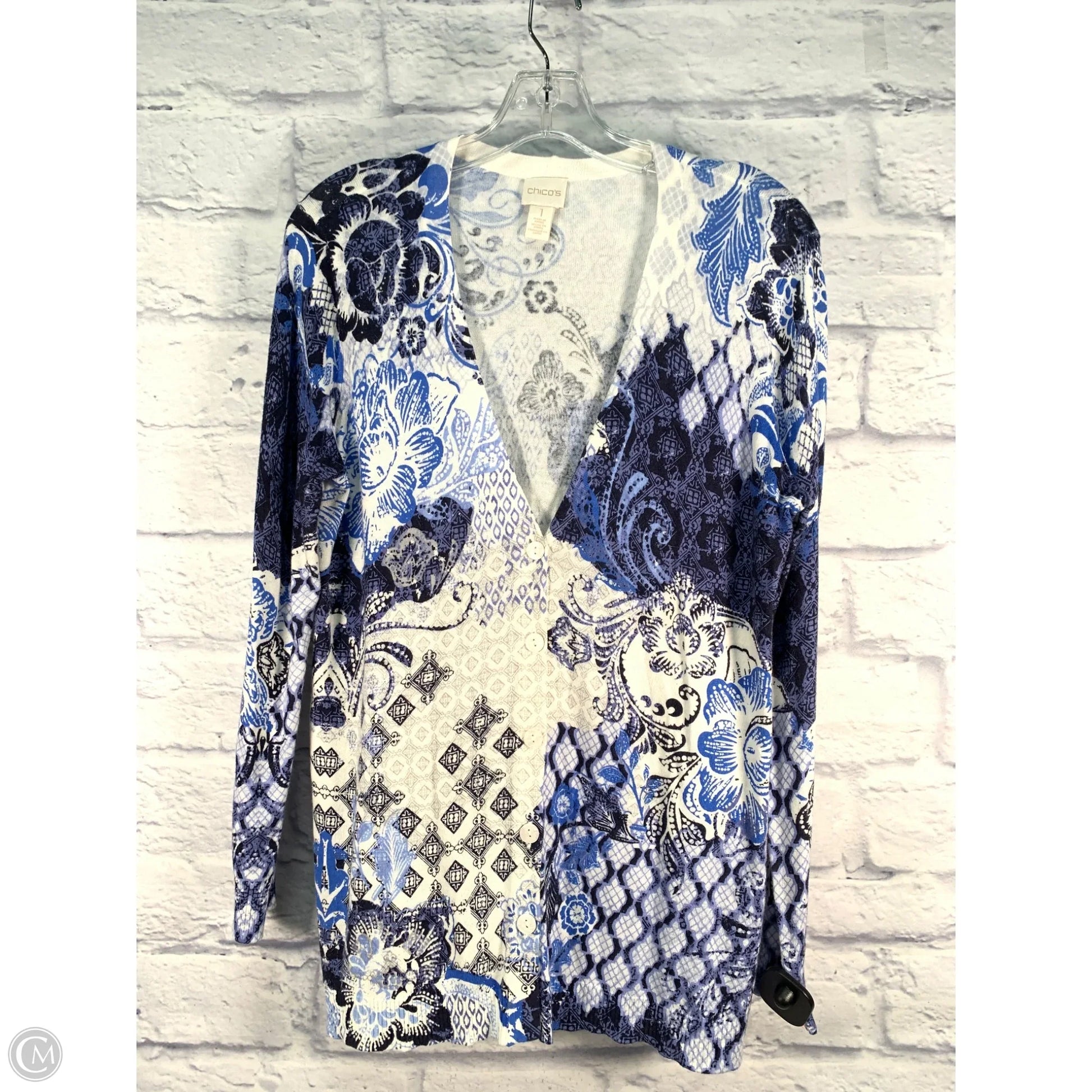 Sweater Cardigan By Chicos In Blue & White, Size: M