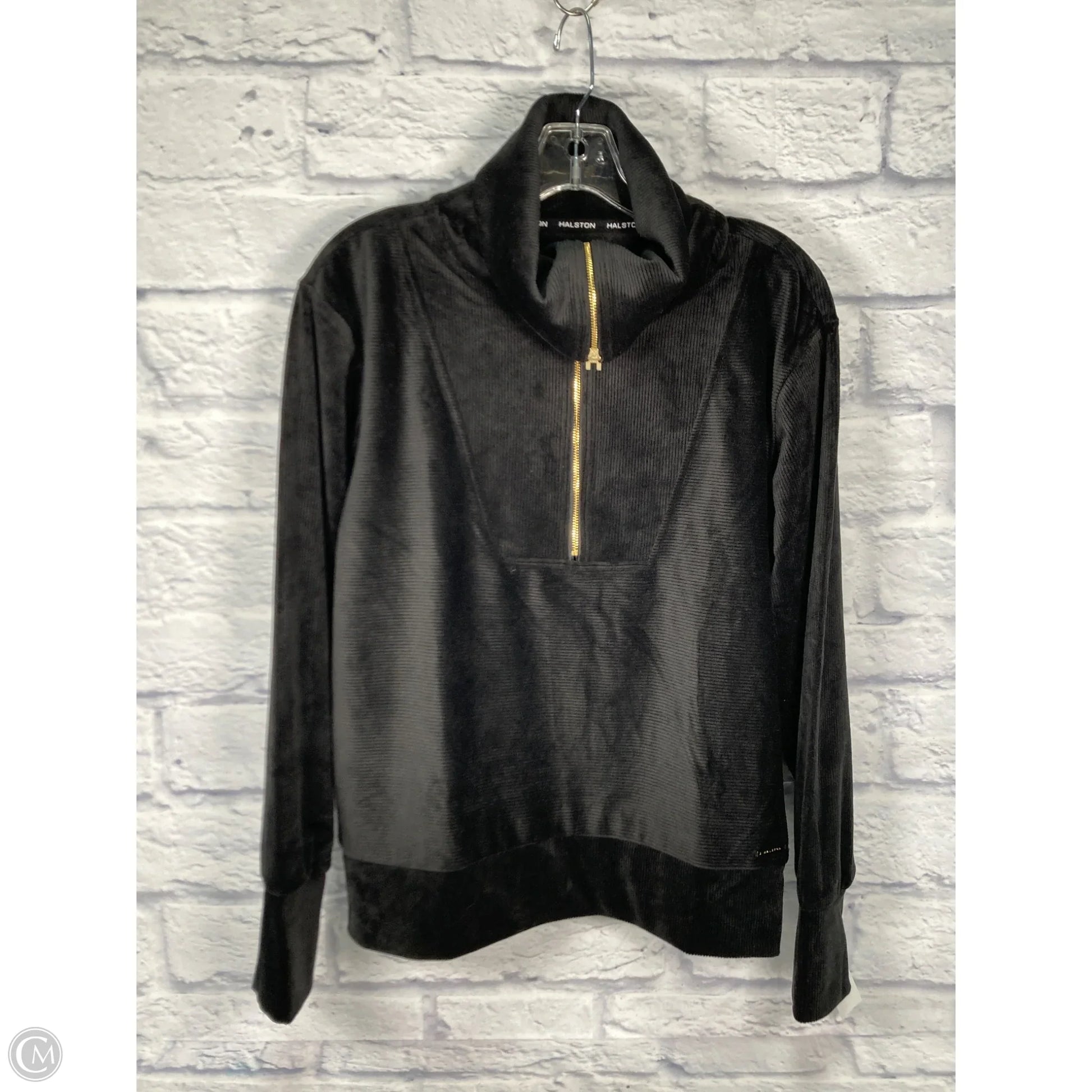 Command attention in this Halston black and gold designer sweatshirt; a size M marvel of style.