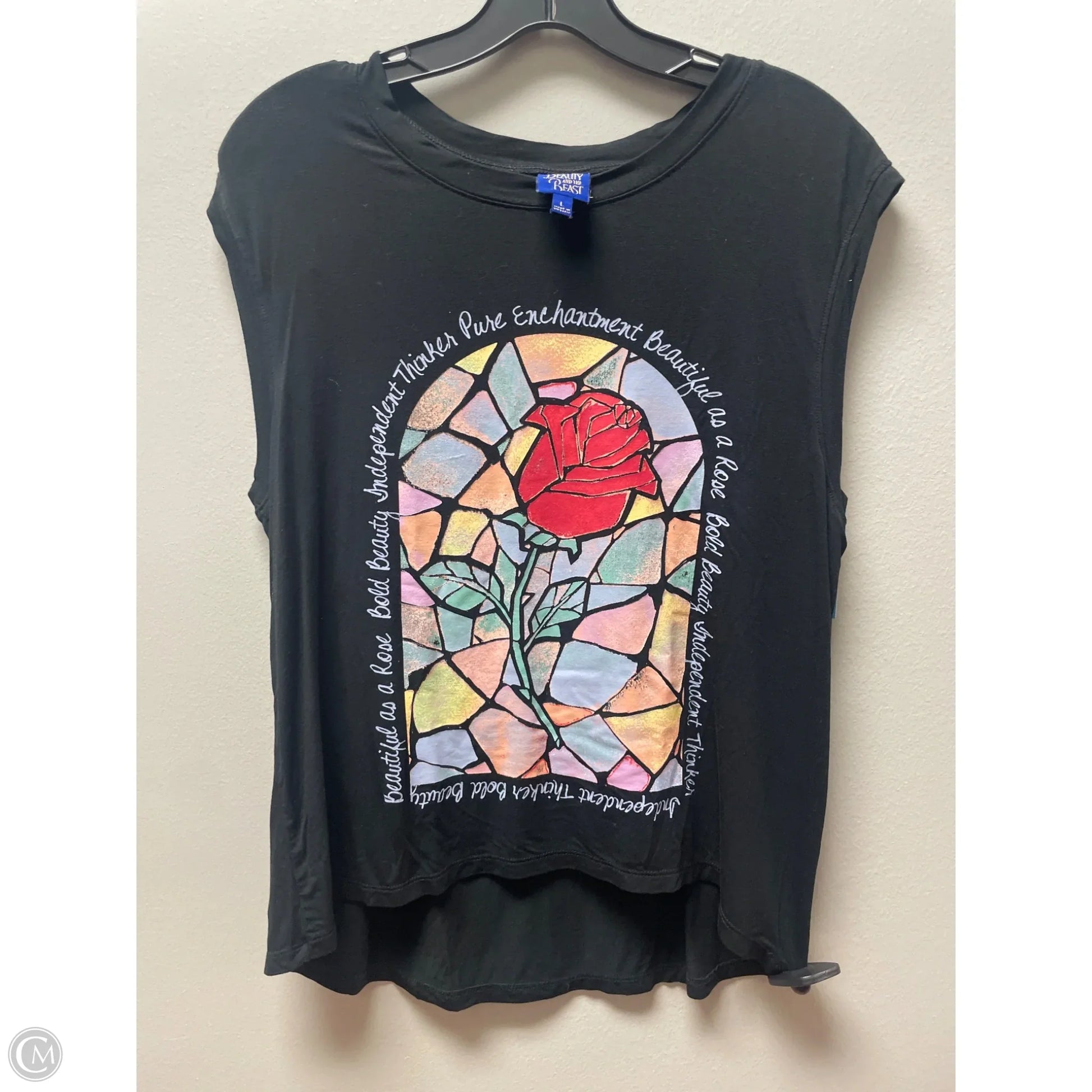 Experience comfort and style with Disney's black top in size L. Perfect for everyday wear with a touch of magic.