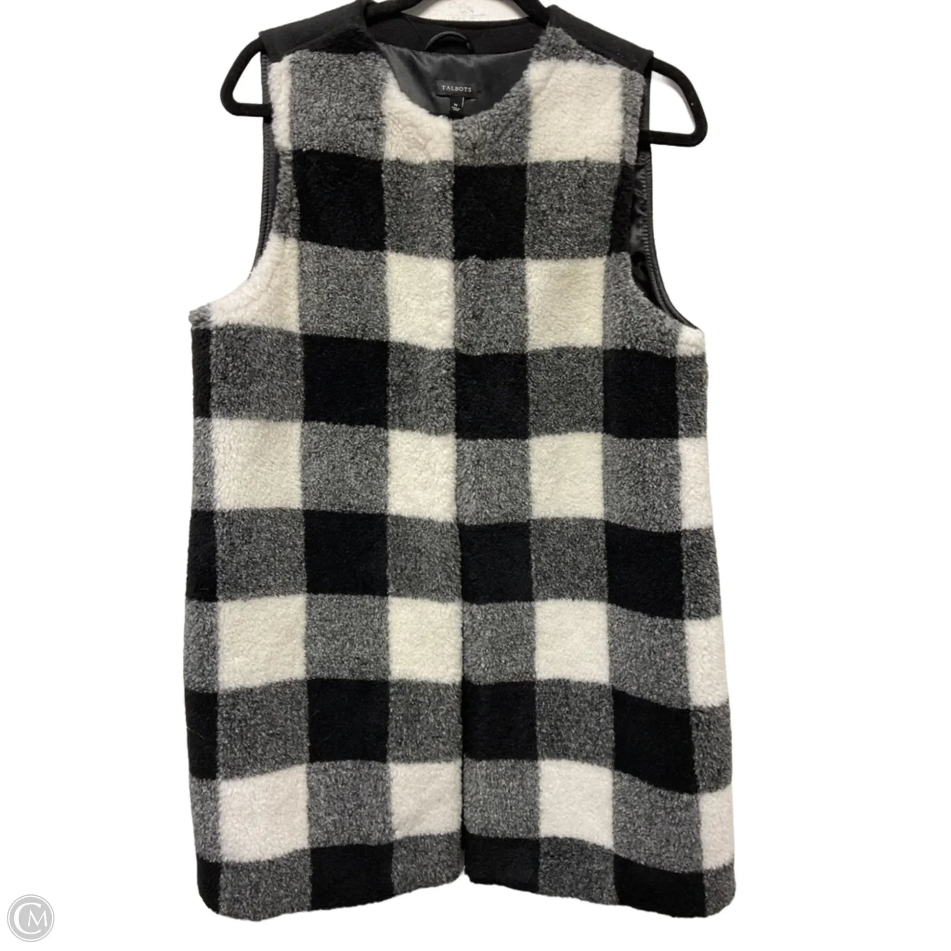 Indulge in cozy elegance with the Talbots Black & White Fleece Vest, Size M. Embrace sophistication and warmth effortlessly.