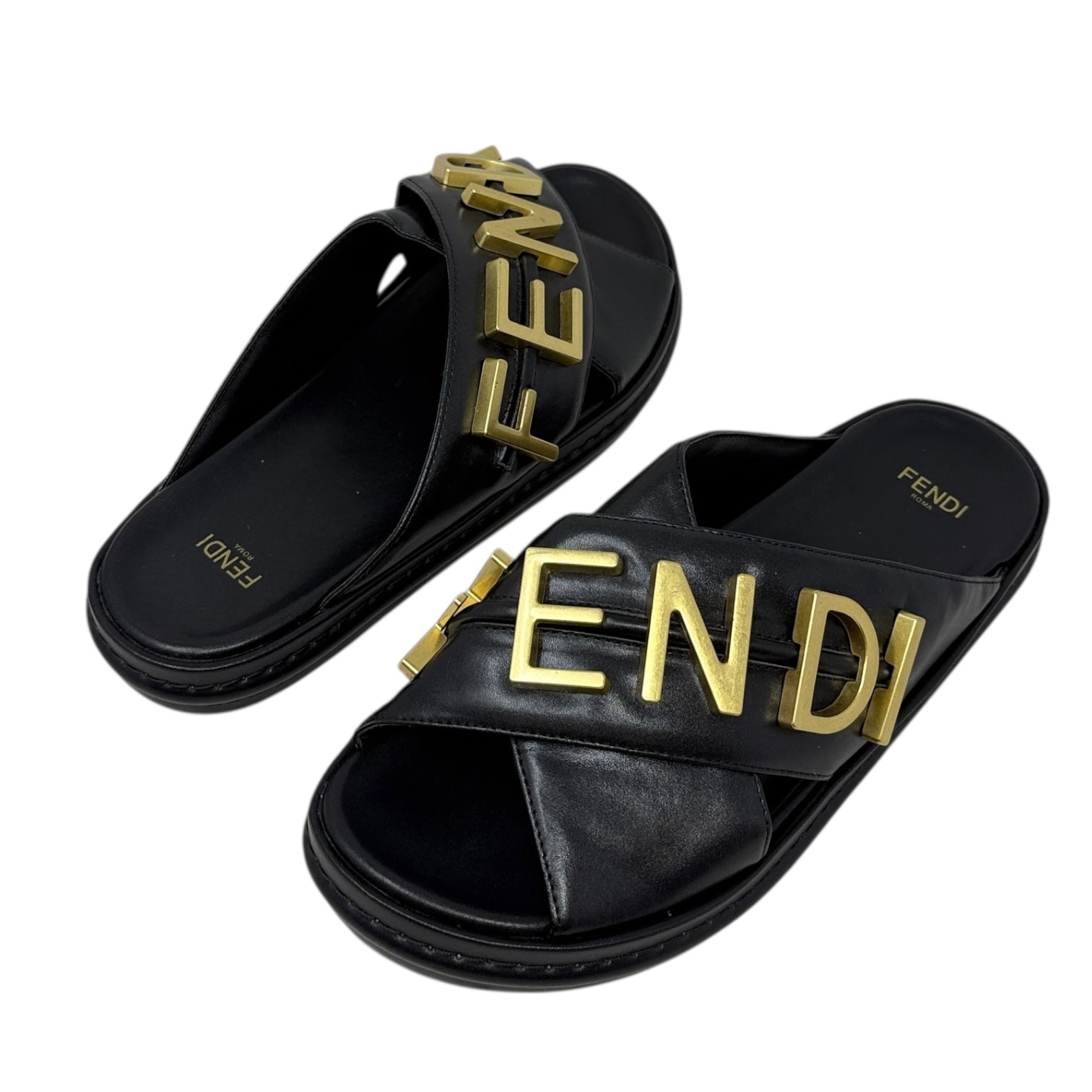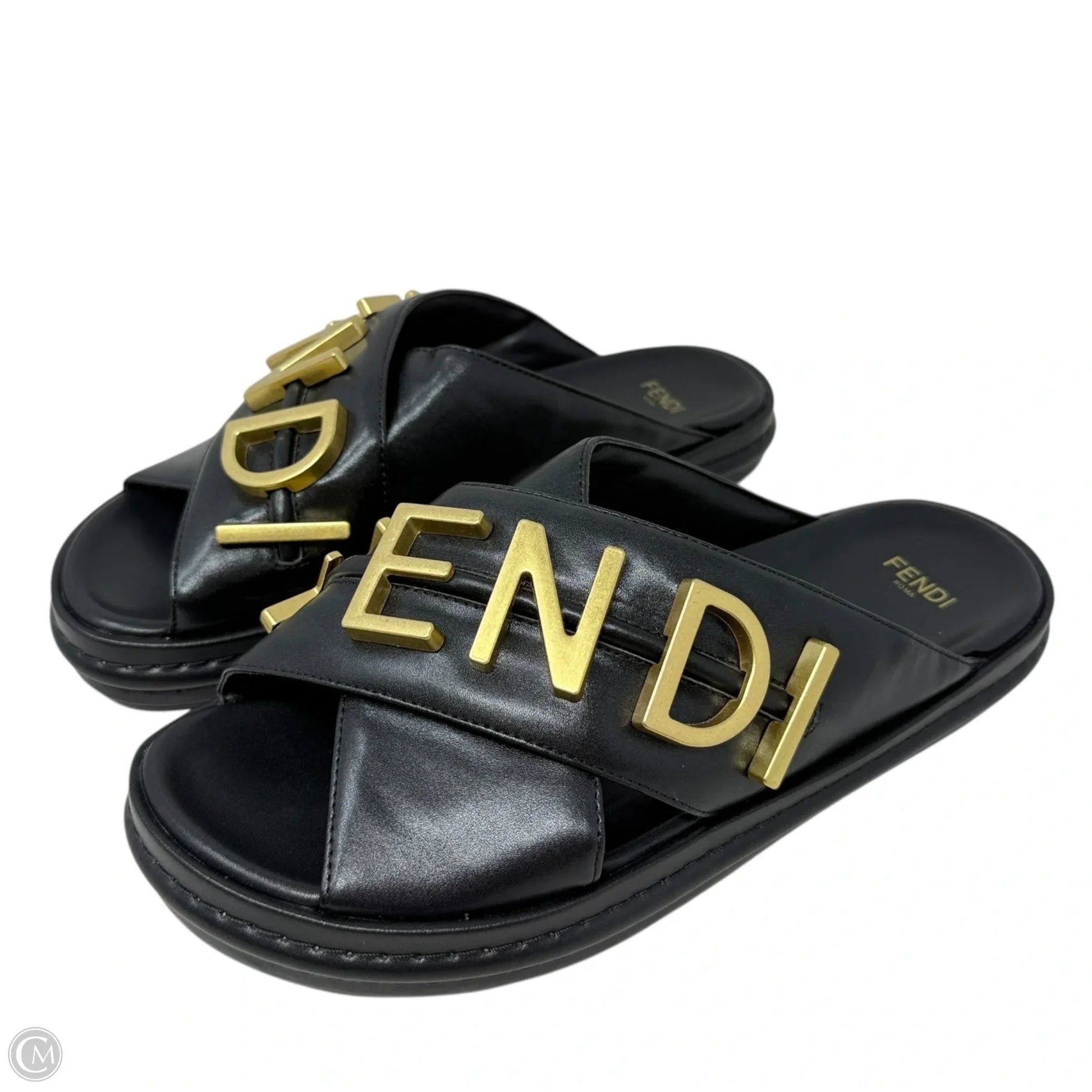 Vitello Fendigraphy Slide Sandals Luxury Designer By Fendi In Black & Gold, Size: US 7 (IT 37)